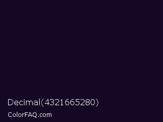 Decimal 4321665280 Color is a almost black violet color and the nearest color is Deep Ebony #0c0b1d. Hex code #140824 and RGB value is rgb(20,8,36). In RGB color space, this color is composed of 8% red, 3% green, 14% blue, In CMYK color space, this color is composed of 44% cyan, 78% magenta, 0% yellow , 86% black , In HSL color space, this color has a hue angle of 266° , 64% saturation and 9% lightness.