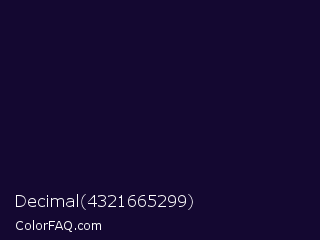 Decimal 4321665299 Color is a very dark indigo color and the nearest color is Black Rock #0d0332. Hex code #140831 and RGB value is rgb(20,8,49). In RGB color space, this color is composed of 8% red, 3% green, 19% blue, In CMYK color space, this color is composed of 59% cyan, 84% magenta, 0% yellow , 81% black , In HSL color space, this color has a hue angle of 258° , 72% saturation and 11% lightness.