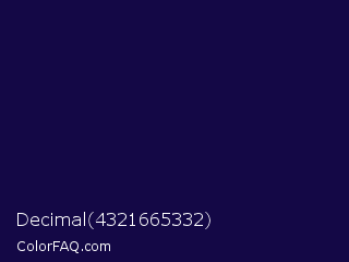 Decimal 4321665332 Color is a very dark indigo color and the nearest color is Tolopea #1b0245. Hex code #140846 and RGB value is rgb(20,8,70). In RGB color space, this color is composed of 8% red, 3% green, 27% blue, In CMYK color space, this color is composed of 71% cyan, 89% magenta, 0% yellow , 73% black , In HSL color space, this color has a hue angle of 252° , 79% saturation and 15% lightness.