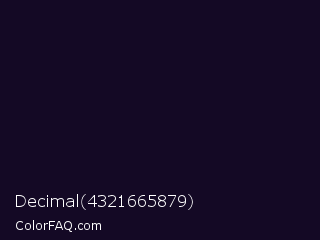 Decimal 4321665879 Color is a almost black violet color and the nearest color is Deep Ebony #0c0b1d. Hex code #140925 and RGB value is rgb(20,9,37). In RGB color space, this color is composed of 8% red, 4% green, 15% blue, In CMYK color space, this color is composed of 46% cyan, 76% magenta, 0% yellow , 85% black , In HSL color space, this color has a hue angle of 264° , 61% saturation and 9% lightness.
