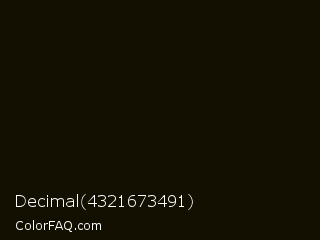 Decimal 4321673491 Color is a almost black yellow color and the nearest color is Green Waterloo #101405. Hex code #141001 and RGB value is rgb(20,16,1). In RGB color space, this color is composed of 8% red, 6% green, 0% blue, In CMYK color space, this color is composed of 0% cyan, 20% magenta, 95% yellow , 92% black , In HSL color space, this color has a hue angle of 47° , 90% saturation and 4% lightness.