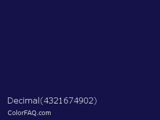 Decimal 4321674902 Color is a very dark indigo color and the nearest color is Bunting #151f4c. Hex code #141248 and RGB value is rgb(20,18,72). In RGB color space, this color is composed of 8% red, 7% green, 28% blue, In CMYK color space, this color is composed of 72% cyan, 75% magenta, 0% yellow , 72% black , In HSL color space, this color has a hue angle of 242° , 60% saturation and 18% lightness.