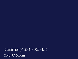 Decimal 4321706545 Color is a very dark blue color and the nearest color is Bunting #151f4c. Hex code #141847 and RGB value is rgb(20,24,71). In RGB color space, this color is composed of 8% red, 9% green, 28% blue, In CMYK color space, this color is composed of 72% cyan, 66% magenta, 0% yellow , 72% black , In HSL color space, this color has a hue angle of 235° , 56% saturation and 18% lightness.