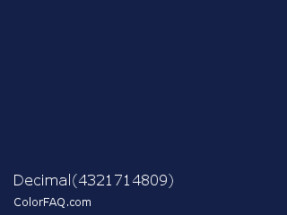 Decimal 4321714809 Color is a very dark blue color and the nearest color is Bunting #151f4c. Hex code #142047 and RGB value is rgb(20,32,71). In RGB color space, this color is composed of 8% red, 13% green, 28% blue, In CMYK color space, this color is composed of 72% cyan, 55% magenta, 0% yellow , 72% black , In HSL color space, this color has a hue angle of 226° , 56% saturation and 18% lightness.