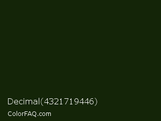Decimal 4321719446 Color is a almost black green color and the nearest color is Pine Tree #171f04. Hex code #142508 and RGB value is rgb(20,37,8). In RGB color space, this color is composed of 8% red, 15% green, 3% blue, In CMYK color space, this color is composed of 46% cyan, 0% magenta, 78% yellow , 85% black , In HSL color space, this color has a hue angle of 95° , 64% saturation and 9% lightness.