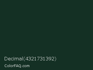Decimal 4321731392 Color is a very dark green color and the nearest color is Celtic #163222. Hex code #143024 and RGB value is rgb(20,48,36). In RGB color space, this color is composed of 8% red, 19% green, 14% blue, In CMYK color space, this color is composed of 58% cyan, 0% magenta, 25% yellow , 81% black , In HSL color space, this color has a hue angle of 154° , 41% saturation and 13% lightness.