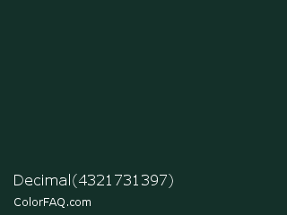 Decimal 4321731397 Color is a very dark cyan color and the nearest color is Timber Green #16322c. Hex code #143029 and RGB value is rgb(20,48,41). In RGB color space, this color is composed of 8% red, 19% green, 16% blue, In CMYK color space, this color is composed of 58% cyan, 0% magenta, 15% yellow , 81% black , In HSL color space, this color has a hue angle of 165° , 41% saturation and 13% lightness.