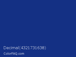 Decimal 4321731638 Color is a dark blue color and the nearest color is St Patricks Blue #23297a. Hex code #143084 and RGB value is rgb(20,48,132). In RGB color space, this color is composed of 8% red, 19% green, 52% blue, In CMYK color space, this color is composed of 85% cyan, 64% magenta, 0% yellow , 48% black , In HSL color space, this color has a hue angle of 225° , 74% saturation and 30% lightness.