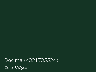 Decimal 4321735524 Color is a very dark green color and the nearest color is Phthalo Green #123524. Hex code #143424 and RGB value is rgb(20,52,36). In RGB color space, this color is composed of 8% red, 20% green, 14% blue, In CMYK color space, this color is composed of 62% cyan, 0% magenta, 31% yellow , 80% black , In HSL color space, this color has a hue angle of 150° , 44% saturation and 14% lightness.