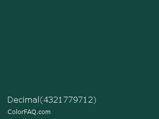 Decimal 4321779712 Color is a very dark cyan color and the nearest color is MSU Green #18453b. Hex code #144640 and RGB value is rgb(20,70,64). In RGB color space, this color is composed of 8% red, 27% green, 25% blue, In CMYK color space, this color is composed of 71% cyan, 0% magenta, 9% yellow , 73% black , In HSL color space, this color has a hue angle of 173° , 56% saturation and 18% lightness.