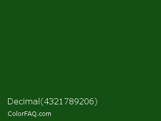 Decimal 4321789206 Color is a very dark green color and the nearest color is Parsley #134f19. Hex code #145014 and RGB value is rgb(20,80,20). In RGB color space, this color is composed of 8% red, 31% green, 8% blue, In CMYK color space, this color is composed of 75% cyan, 0% magenta, 75% yellow , 69% black , In HSL color space, this color has a hue angle of 120° , 60% saturation and 20% lightness.