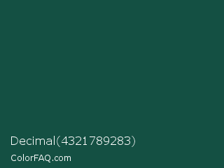 Decimal 4321789283 Color is a very dark cyan color and the nearest color is Brunswick Green #1b4d3e. Hex code #145043 and RGB value is rgb(20,80,67). In RGB color space, this color is composed of 8% red, 31% green, 26% blue, In CMYK color space, this color is composed of 75% cyan, 0% magenta, 16% yellow , 69% black , In HSL color space, this color has a hue angle of 167° , 60% saturation and 20% lightness.