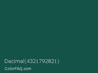 Decimal 4321792821 Color is a very dark cyan color and the nearest color is Eden #105852. Hex code #145347 and RGB value is rgb(20,83,71). In RGB color space, this color is composed of 8% red, 33% green, 28% blue, In CMYK color space, this color is composed of 76% cyan, 0% magenta, 14% yellow , 67% black , In HSL color space, this color has a hue angle of 169° , 61% saturation and 20% lightness.