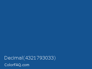 Decimal 4321793033 Color is a normal blue color and the nearest color is Yale Blue #0f4d92. Hex code #145391 and RGB value is rgb(20,83,145). In RGB color space, this color is composed of 8% red, 33% green, 57% blue, In CMYK color space, this color is composed of 86% cyan, 43% magenta, 0% yellow , 43% black , In HSL color space, this color has a hue angle of 210° , 76% saturation and 32% lightness.