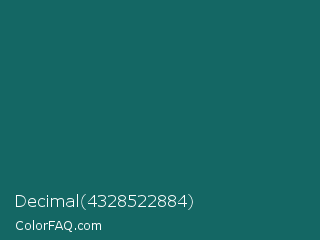 Decimal 4328522884 Color is a dark cyan color and the nearest color is Genoa #15736b. Hex code #146764 and RGB value is rgb(20,103,100). In RGB color space, this color is composed of 8% red, 40% green, 39% blue, In CMYK color space, this color is composed of 81% cyan, 0% magenta, 3% yellow , 60% black , In HSL color space, this color has a hue angle of 178° , 67% saturation and 24% lightness.