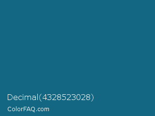 Decimal 4328523028 Color is a dark blue color and the nearest color is Blue Sapphire #126180. Hex code #146782 and RGB value is rgb(20,103,130). In RGB color space, this color is composed of 8% red, 40% green, 51% blue, In CMYK color space, this color is composed of 85% cyan, 21% magenta, 0% yellow , 49% black , In HSL color space, this color has a hue angle of 195° , 73% saturation and 29% lightness.
