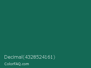 Decimal 4328524161 Color is a dark cyan color and the nearest color is Watercourse #056f57. Hex code #146955 and RGB value is rgb(20,105,85). In RGB color space, this color is composed of 8% red, 41% green, 33% blue, In CMYK color space, this color is composed of 81% cyan, 0% magenta, 19% yellow , 59% black , In HSL color space, this color has a hue angle of 166° , 68% saturation and 25% lightness.