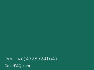Decimal 4328524164 Color is a dark cyan color and the nearest color is Watercourse #056f57. Hex code #146958 and RGB value is rgb(20,105,88). In RGB color space, this color is composed of 8% red, 41% green, 35% blue, In CMYK color space, this color is composed of 81% cyan, 0% magenta, 16% yellow , 59% black , In HSL color space, this color has a hue angle of 168° , 68% saturation and 25% lightness.