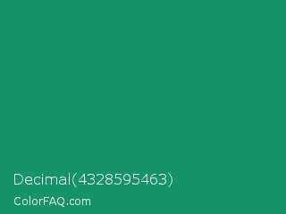 Decimal 4328595463 Color is a normal green color and the nearest color is Green Cyan #009966. Hex code #149467 and RGB value is rgb(20,148,103). In RGB color space, this color is composed of 8% red, 58% green, 40% blue, In CMYK color space, this color is composed of 86% cyan, 0% magenta, 30% yellow , 42% black , In HSL color space, this color has a hue angle of 159° , 76% saturation and 33% lightness.