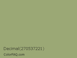 Decimal 270537221 Color is a normal lime color and the nearest color is Green Smoke #a4af6e. Hex code #9ba875 and RGB value is rgb(155,168,117). In RGB color space, this color is composed of 61% red, 66% green, 46% blue, In CMYK color space, this color is composed of 8% cyan, 0% magenta, 30% yellow , 34% black , In HSL color space, this color has a hue angle of 75° , 23% saturation and 56% lightness.
