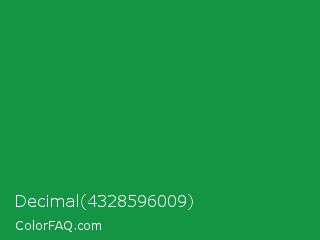 Decimal 4328596009 Color is a normal green color and the nearest color is Spanish Green #009150. Hex code #149545 and RGB value is rgb(20,149,69). In RGB color space, this color is composed of 8% red, 58% green, 27% blue, In CMYK color space, this color is composed of 87% cyan, 0% magenta, 54% yellow , 42% black , In HSL color space, this color has a hue angle of 143° , 76% saturation and 33% lightness.