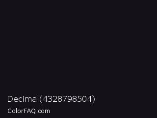 Decimal 4328798504 Color is a almost black purple color and the nearest color is Vulcan #10121d. Hex code #151118 and RGB value is rgb(21,17,24). In RGB color space, this color is composed of 8% red, 7% green, 9% blue, In CMYK color space, this color is composed of 13% cyan, 29% magenta, 0% yellow , 91% black , In HSL color space, this color has a hue angle of 274° , 17% saturation and 8% lightness.