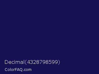 Decimal 4328798599 Color is a very dark indigo color and the nearest color is Bunting #151f4c. Hex code #151153 and RGB value is rgb(21,17,83). In RGB color space, this color is composed of 8% red, 7% green, 33% blue, In CMYK color space, this color is composed of 75% cyan, 80% magenta, 0% yellow , 67% black , In HSL color space, this color has a hue angle of 244° , 66% saturation and 20% lightness.
