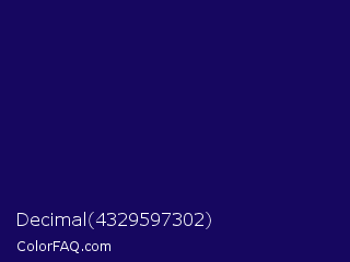 Decimal 4329597302 Color is a very dark indigo color and the nearest color is Arapawa #110c6c. Hex code #160760 and RGB value is rgb(22,7,96). In RGB color space, this color is composed of 9% red, 3% green, 38% blue, In CMYK color space, this color is composed of 77% cyan, 93% magenta, 0% yellow , 62% black , In HSL color space, this color has a hue angle of 250° , 86% saturation and 20% lightness.