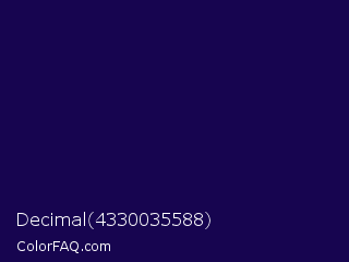 Decimal 4330035588 Color is a very dark indigo color and the nearest color is Tolopea #1b0245. Hex code #170550 and RGB value is rgb(23,5,80). In RGB color space, this color is composed of 9% red, 2% green, 31% blue, In CMYK color space, this color is composed of 71% cyan, 94% magenta, 0% yellow , 69% black , In HSL color space, this color has a hue angle of 254° , 88% saturation and 17% lightness.
