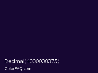 Decimal 4330038375 Color is a very dark violet color and the nearest color is Haiti #1b1035. Hex code #170733 and RGB value is rgb(23,7,51). In RGB color space, this color is composed of 9% red, 3% green, 20% blue, In CMYK color space, this color is composed of 55% cyan, 86% magenta, 0% yellow , 80% black , In HSL color space, this color has a hue angle of 262° , 76% saturation and 11% lightness.