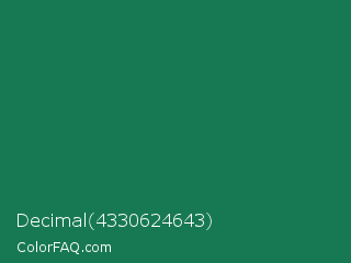 Decimal 4330624643 Color is a dark green color and the nearest color is Dark Spring Green #177245. Hex code #177953 and RGB value is rgb(23,121,83). In RGB color space, this color is composed of 9% red, 47% green, 33% blue, In CMYK color space, this color is composed of 81% cyan, 0% magenta, 31% yellow , 53% black , In HSL color space, this color has a hue angle of 157° , 68% saturation and 28% lightness.