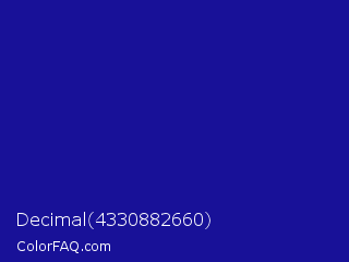Decimal 4330882660 Color is a normal indigo color and the nearest color is Ultramarine #120a8f. Hex code #181198 and RGB value is rgb(24,17,152). In RGB color space, this color is composed of 9% red, 7% green, 60% blue, In CMYK color space, this color is composed of 84% cyan, 89% magenta, 0% yellow , 40% black , In HSL color space, this color has a hue angle of 243° , 80% saturation and 33% lightness.