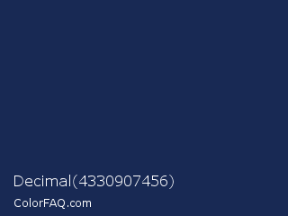Decimal 4330907456 Color is a very dark blue color and the nearest color is Space Cadet #1d2951. Hex code #182954 and RGB value is rgb(24,41,84). In RGB color space, this color is composed of 9% red, 16% green, 33% blue, In CMYK color space, this color is composed of 71% cyan, 51% magenta, 0% yellow , 67% black , In HSL color space, this color has a hue angle of 223° , 56% saturation and 21% lightness.
