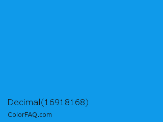 Decimal 16918168 Color is a normal blue color and the nearest color is Button Blue #24a0ed. Hex code #0f9aea and RGB value is rgb(15,154,234). In RGB color space, this color is composed of 6% red, 60% green, 92% blue, In CMYK color space, this color is composed of 94% cyan, 34% magenta, 0% yellow , 8% black , In HSL color space, this color has a hue angle of 202° , 88% saturation and 49% lightness.