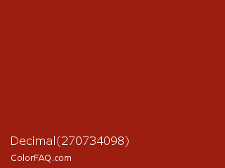 Decimal 270734098 Color is a normal red color and the nearest color is Tamarillo #991613. Hex code #9c1e10 and RGB value is rgb(156,30,16). In RGB color space, this color is composed of 61% red, 12% green, 6% blue, In CMYK color space, this color is composed of 0% cyan, 81% magenta, 90% yellow , 39% black , In HSL color space, this color has a hue angle of 6° , 81% saturation and 34% lightness.