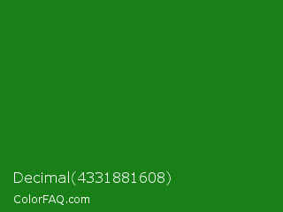 Decimal 4331881608 Color is a dark green color and the nearest color is Forest Green #228b22. Hex code #198018 and RGB value is rgb(25,128,24). In RGB color space, this color is composed of 10% red, 50% green, 9% blue, In CMYK color space, this color is composed of 80% cyan, 0% magenta, 81% yellow , 50% black , In HSL color space, this color has a hue angle of 119° , 68% saturation and 30% lightness.