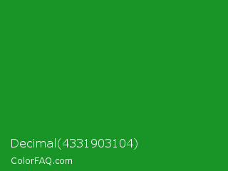 Decimal 4331903104 Color is a normal green color and the nearest color is Forest Green #228b22. Hex code #199528 and RGB value is rgb(25,149,40). In RGB color space, this color is composed of 10% red, 58% green, 16% blue, In CMYK color space, this color is composed of 83% cyan, 0% magenta, 73% yellow , 42% black , In HSL color space, this color has a hue angle of 127° , 71% saturation and 34% lightness.