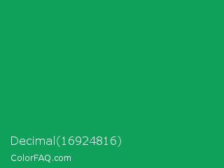 Decimal 16924816 Color is a normal green color and the nearest color is Shamrock Green #009e60. Hex code #0fa05a and RGB value is rgb(15,160,90). In RGB color space, this color is composed of 6% red, 63% green, 35% blue, In CMYK color space, this color is composed of 91% cyan, 0% magenta, 44% yellow , 37% black , In HSL color space, this color has a hue angle of 151° , 83% saturation and 34% lightness.