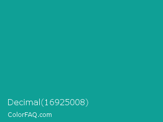 Decimal 16925008 Color is a normal cyan color and the nearest color is Niagara #06a189. Hex code #0fa096 and RGB value is rgb(15,160,150). In RGB color space, this color is composed of 6% red, 63% green, 59% blue, In CMYK color space, this color is composed of 91% cyan, 0% magenta, 6% yellow , 37% black , In HSL color space, this color has a hue angle of 176° , 83% saturation and 34% lightness.