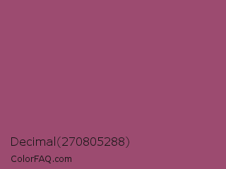 Decimal 270805288 Color is a normal rose color and the nearest color is Magenta Haze #9f4576. Hex code #9c4b70 and RGB value is rgb(156,75,112). In RGB color space, this color is composed of 61% red, 29% green, 44% blue, In CMYK color space, this color is composed of 0% cyan, 52% magenta, 28% yellow , 39% black , In HSL color space, this color has a hue angle of 333° , 35% saturation and 45% lightness.