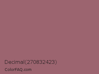 Decimal 270832423 Color is a normal red color and the nearest color is Rose Dust #9e5e6f. Hex code #9c646f and RGB value is rgb(156,100,111). In RGB color space, this color is composed of 61% red, 39% green, 44% blue, In CMYK color space, this color is composed of 0% cyan, 36% magenta, 29% yellow , 39% black , In HSL color space, this color has a hue angle of 348° , 22% saturation and 50% lightness.