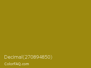 Decimal 270894850 Color is a normal yellow color and the nearest color is Dark Yellow #9b870c. Hex code #9c890e and RGB value is rgb(156,137,14). In RGB color space, this color is composed of 61% red, 54% green, 5% blue, In CMYK color space, this color is composed of 0% cyan, 12% magenta, 91% yellow , 39% black , In HSL color space, this color has a hue angle of 52° , 84% saturation and 33% lightness.