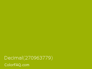 Decimal 270963779 Color is a normal yellow color and the nearest color is Apple Green #8db600. Hex code #9cb303 and RGB value is rgb(156,179,3). In RGB color space, this color is composed of 61% red, 70% green, 1% blue, In CMYK color space, this color is composed of 13% cyan, 0% magenta, 98% yellow , 30% black , In HSL color space, this color has a hue angle of 68° , 97% saturation and 36% lightness.