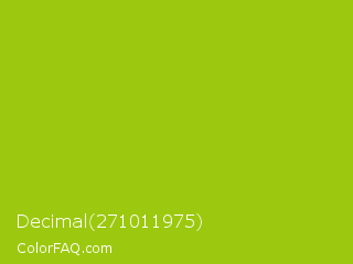 Decimal 271011975 Color is a normal lime color and the nearest color is Citrus #a1c50a. Hex code #9cc90f and RGB value is rgb(156,201,15). In RGB color space, this color is composed of 61% red, 79% green, 6% blue, In CMYK color space, this color is composed of 22% cyan, 0% magenta, 93% yellow , 21% black , In HSL color space, this color has a hue angle of 75° , 86% saturation and 42% lightness.