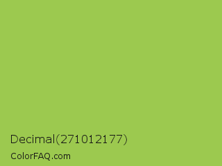 Decimal 271012177 Color is a normal green color and the nearest color is Android Green #a4c639. Hex code #9cc94f and RGB value is rgb(156,201,79). In RGB color space, this color is composed of 61% red, 79% green, 31% blue, In CMYK color space, this color is composed of 22% cyan, 0% magenta, 61% yellow , 21% black , In HSL color space, this color has a hue angle of 82° , 53% saturation and 55% lightness.