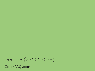Decimal 271013638 Color is a light green color and the nearest color is Pistachio #93c572. Hex code #9ccb7a and RGB value is rgb(156,203,122). In RGB color space, this color is composed of 61% red, 80% green, 48% blue, In CMYK color space, this color is composed of 23% cyan, 0% magenta, 40% yellow , 20% black , In HSL color space, this color has a hue angle of 95° , 44% saturation and 64% lightness.