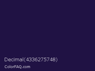 Decimal 4336275748 Color is a very dark indigo color and the nearest color is Violet #240a40. Hex code #201244 and RGB value is rgb(32,18,68). In RGB color space, this color is composed of 13% red, 7% green, 27% blue, In CMYK color space, this color is composed of 53% cyan, 74% magenta, 0% yellow , 73% black , In HSL color space, this color has a hue angle of 257° , 58% saturation and 17% lightness.