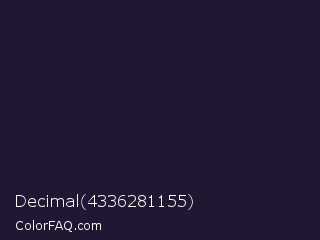 Decimal 4336281155 Color is a very dark indigo color and the nearest color is Haiti #1b1035. Hex code #201833 and RGB value is rgb(32,24,51). In RGB color space, this color is composed of 13% red, 9% green, 20% blue, In CMYK color space, this color is composed of 37% cyan, 53% magenta, 0% yellow , 80% black , In HSL color space, this color has a hue angle of 258° , 36% saturation and 15% lightness.