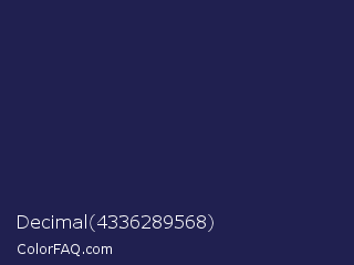 Decimal 4336289568 Color is a very dark blue color and the nearest color is Port Gore #251f4f. Hex code #202050 and RGB value is rgb(32,32,80). In RGB color space, this color is composed of 13% red, 13% green, 31% blue, In CMYK color space, this color is composed of 60% cyan, 60% magenta, 0% yellow , 69% black , In HSL color space, this color has a hue angle of 240° , 43% saturation and 22% lightness.