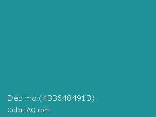 Decimal 4336484913 Color is a normal cyan color and the nearest color is Blue Chill #0c8990. Hex code #209397 and RGB value is rgb(32,147,151). In RGB color space, this color is composed of 13% red, 58% green, 59% blue, In CMYK color space, this color is composed of 79% cyan, 3% magenta, 0% yellow , 41% black , In HSL color space, this color has a hue angle of 182° , 65% saturation and 36% lightness.